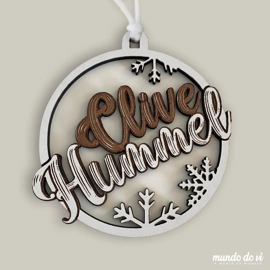 Design: Nome e flocos de neve gravados, ideal para uma decoração natalina inspirada na natureza.